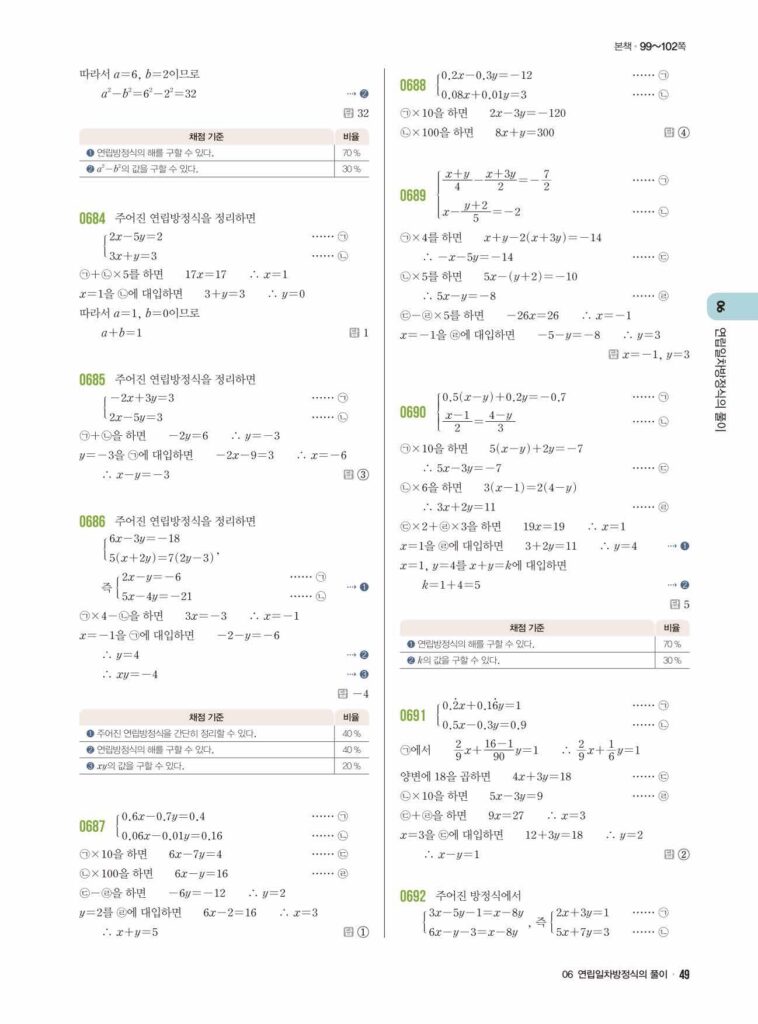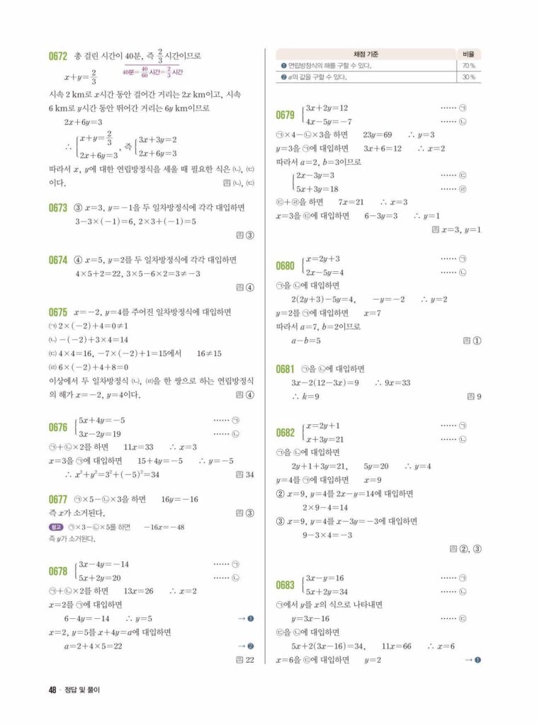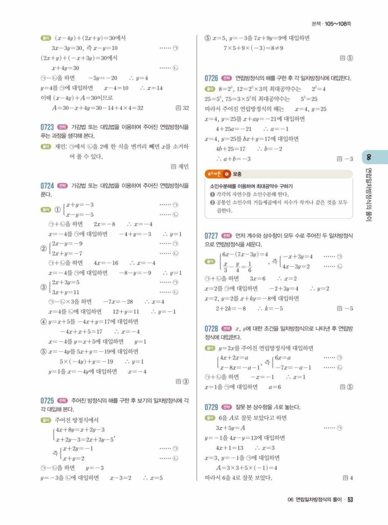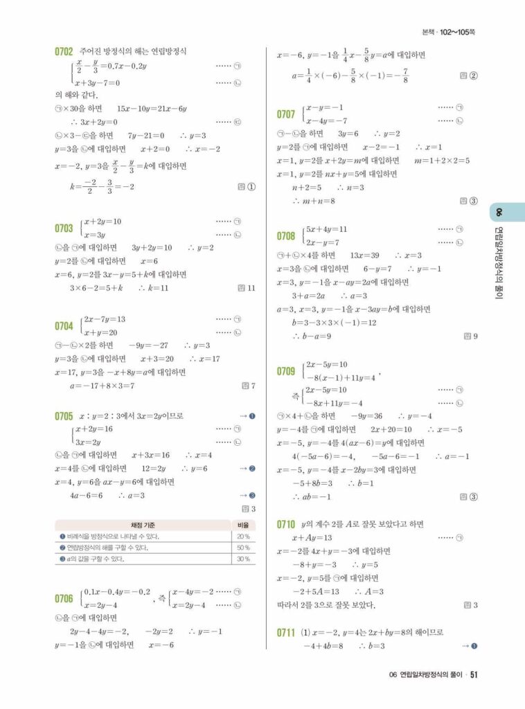 안녕하세요. **라이트쎈 중2-1** **06단원 연립일차방정식의 풀이** 정답 및 해설입니다.