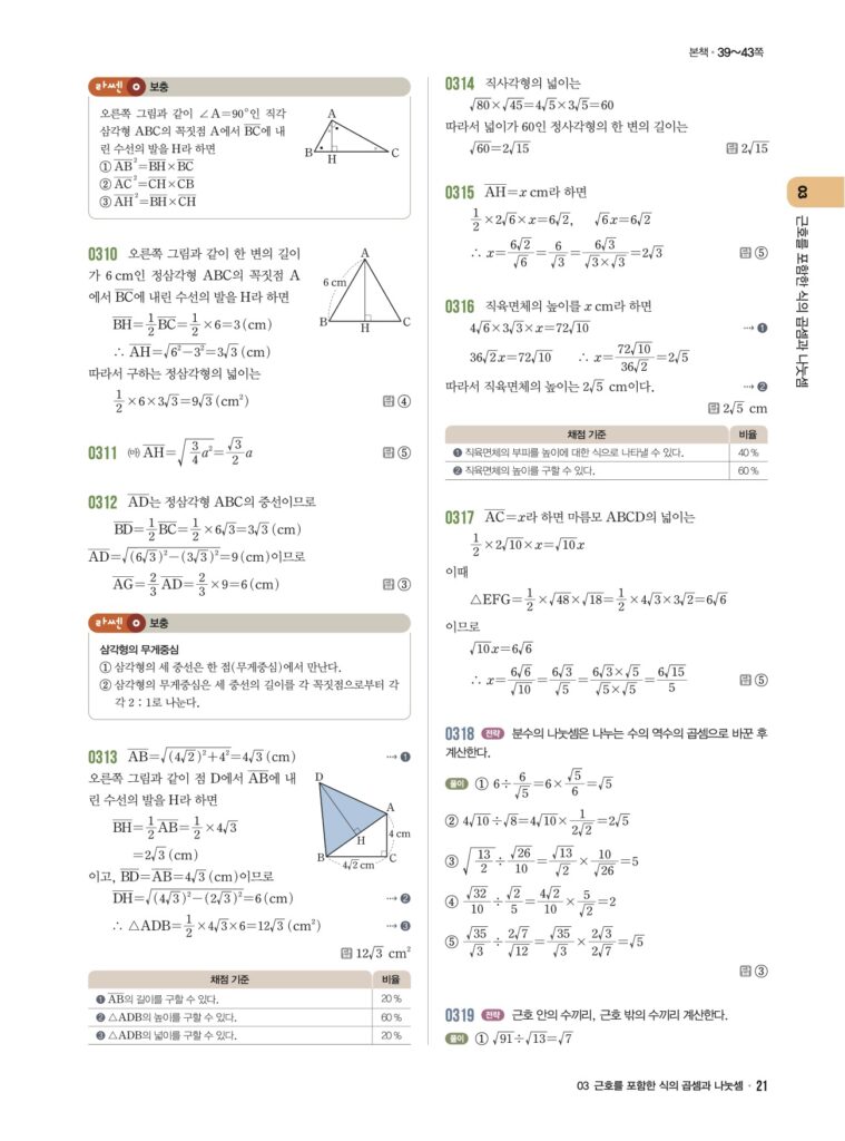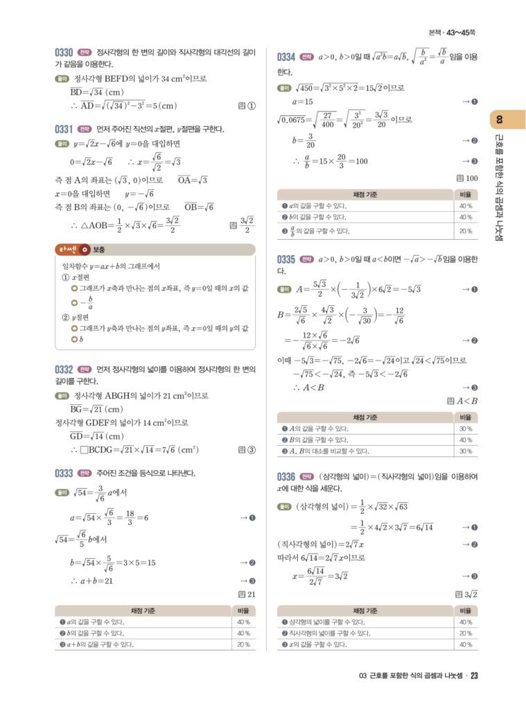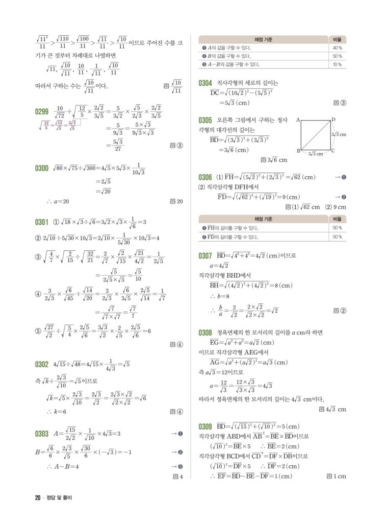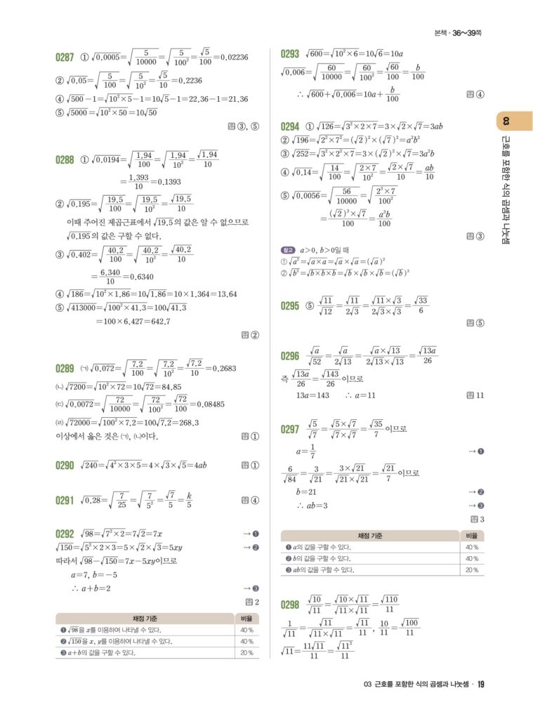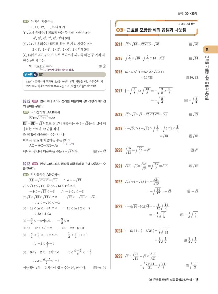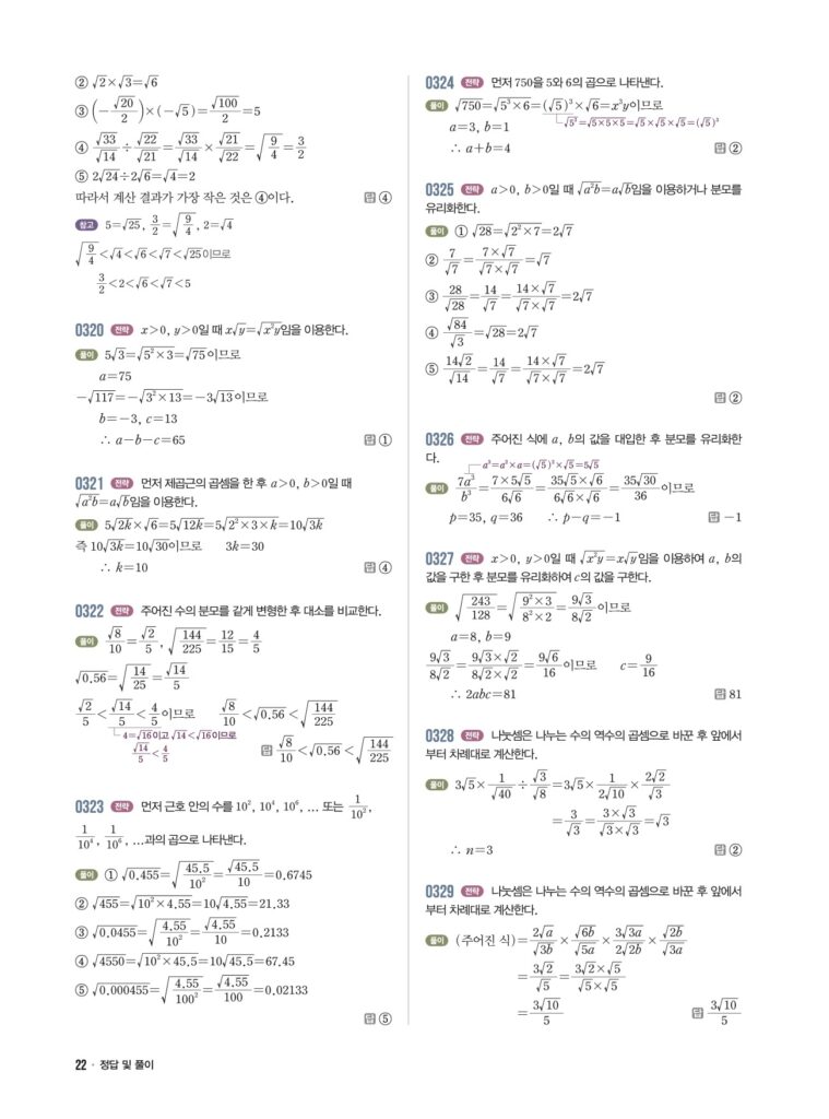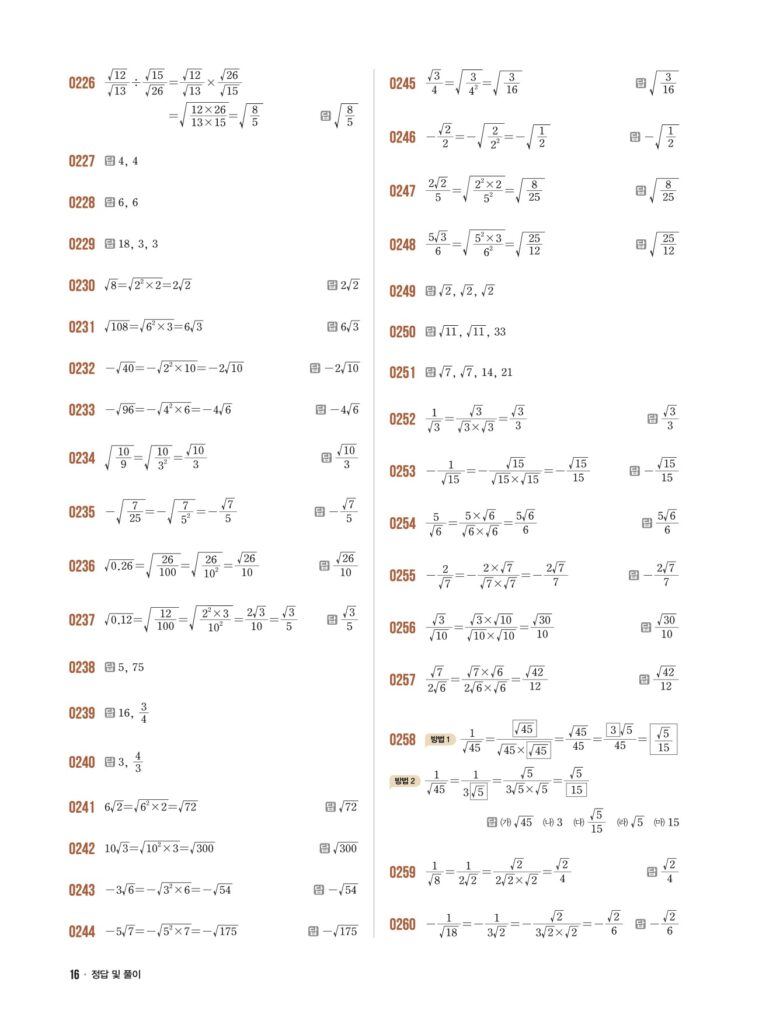 안녕하세요. **라이트쎈 중3-1** **03단원 근호를 포함한 식의 곱셈과 나눗셈** 정답 및 해설입니다.