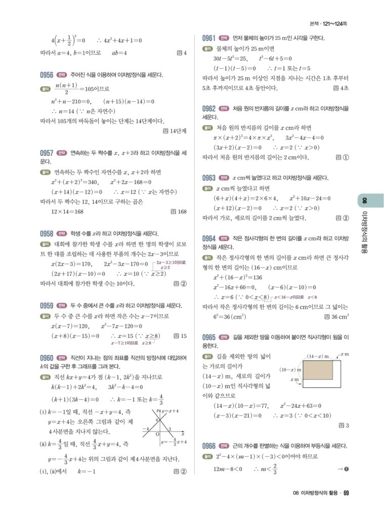 안녕하세요. **라이트쎈 중3-1** **08단원 이차방정식의 활용** 정답 및 해설입니다.